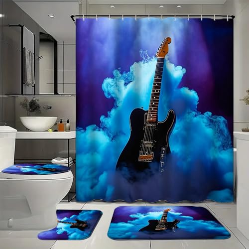Das Set besteht aus einer Badematte, einem U-förmigen Konturteppich, einem Toilettensitzbezug und einem wasserdichten Duschvorhang. Der Duschvorhang ist mit einem abstrakten Aquarell-Musikinstrumenten-Design versehen und passt perfekt zu Teppichen, U-förmigen Matten und WC-Deckeln.