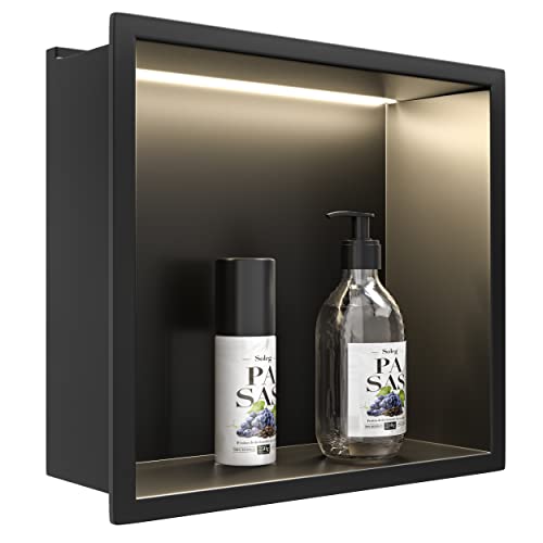Bernkot Wandnische Dusche Edelstahl mit LED-Streifenlicht, 30 cm x 30 cm, Wasserdicht – Keine Fliesen Erforderlich, Badezimmer Lagerung, Nische, Matt Schwarz