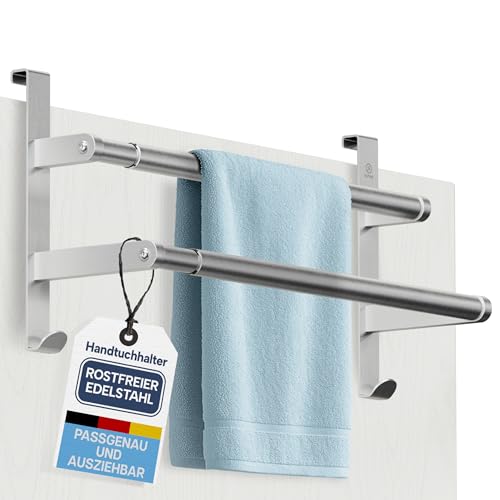 Unser Handtuchhalter ist perfekt für deutsche Türen mit einer Breite von 43 bis 80 cm. Er besteht aus Edelstahl 304, der rostfrei und pflegeleicht ist. Der Handtuchhalter kann nach Bedarf verlängert werden, so dass er immer passend für deine Handtücher ist.
