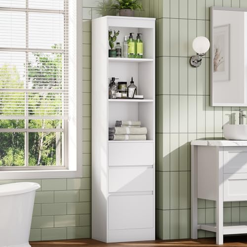Dank seiner kleinen Standfläche kann er problemlos in allen Ecken des Hauses aufgestellt werden: im Bad, in der Küche, im Wohnzimmer usw. Der Hochschrank verfügt über 3 Schubladen und 3 offene Fächer, was ausreichenden Stauraum bietet.