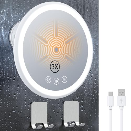 Gospire Beheizter Duschspiegel, beschlagfrei, mit Licht, 5000 mAh Akku, 360° drehbar, 21,1 cm großer Anti-Beschlag-Rasierspiegel mit 3 Farben, stufenlos, dimmbar, inklusive 2 Klebehaken, 3 Stück