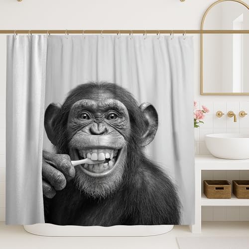 Lustiger Affen-Duschvorhang, schwarz-weiß, Tier-Badezimmer-Dekor, moderner witziger Stil für Kinder, wasserdichter Stoff mit Haken, 183 x 183 cm
