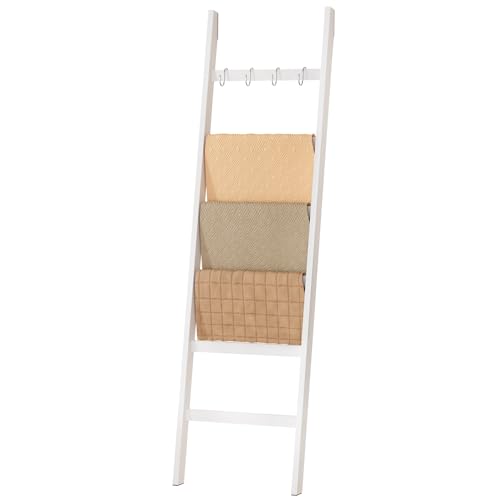 Yorbay Handtuchleiter Bambus, 6 Sprossen, Kleiderleiter mit 2 Sturzsicherheitsriemen und 4 Haken, Handtuchhalter Leiter für Dekoratives Badezimmer, Leiter Deko HxB 170 x 43 cm (Weiß)
